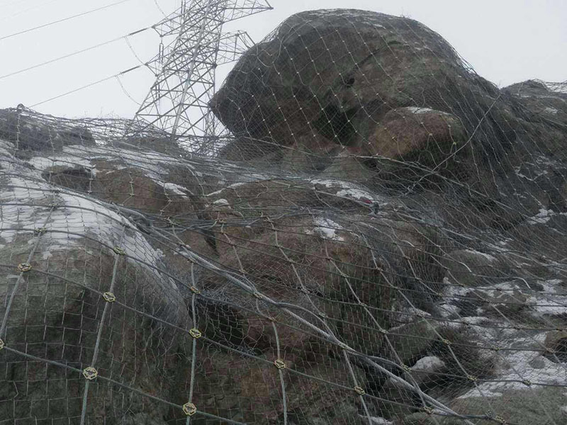 2)鋼絲繩網(wǎng)的編制 鋼絲繩網(wǎng)的編制應(yīng)滿足以下要求: 上下交錯(cuò)編織;編制成網(wǎng)的鋼絲繩不得有斷絲、脫絲現(xiàn)象;交叉節(jié)點(diǎn)處用扣壓件固定,接頭處用搭接件壓接, 不得遺漏,鋼繩露出搭接件長(zhǎng)度至少為10mm;編網(wǎng)時(shí)扣壓件和搭接件用機(jī)械壓接,表面不得有破裂和明顯損傷;網(wǎng)的形狀平整、繩不得有打結(jié)明顯扭曲現(xiàn)象。